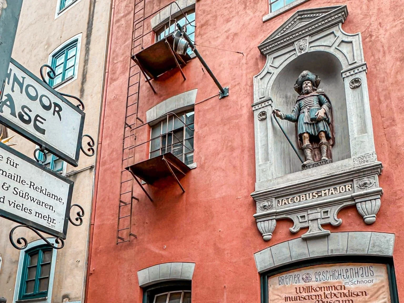 Sfantul Iacob este patronul pelerinilor, astfel ca prezenta sa pe aceasta cladire din Schnoor are legatura cu faptul ca Bremen era un punct important pe rutele de pelerinaj medievale. Schnoor, cu strazile sale inguste si casele vechi, pastreaza inca atmosfera acelor vremuri.